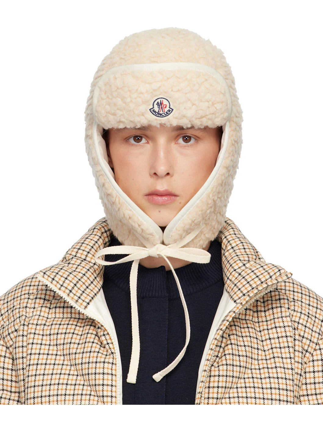 Reversible insulated wool-blend fleece hat. Reverse in white satin. · Embroidered logo patch at face · Ear flaps · Self-tie chin strap Supplier color: White Body: 50% acrylic, 38% wool, 12% polyester. Fill: 100% polyester. Lining: 100% polyester. Made in Bulgaria 252111F014029