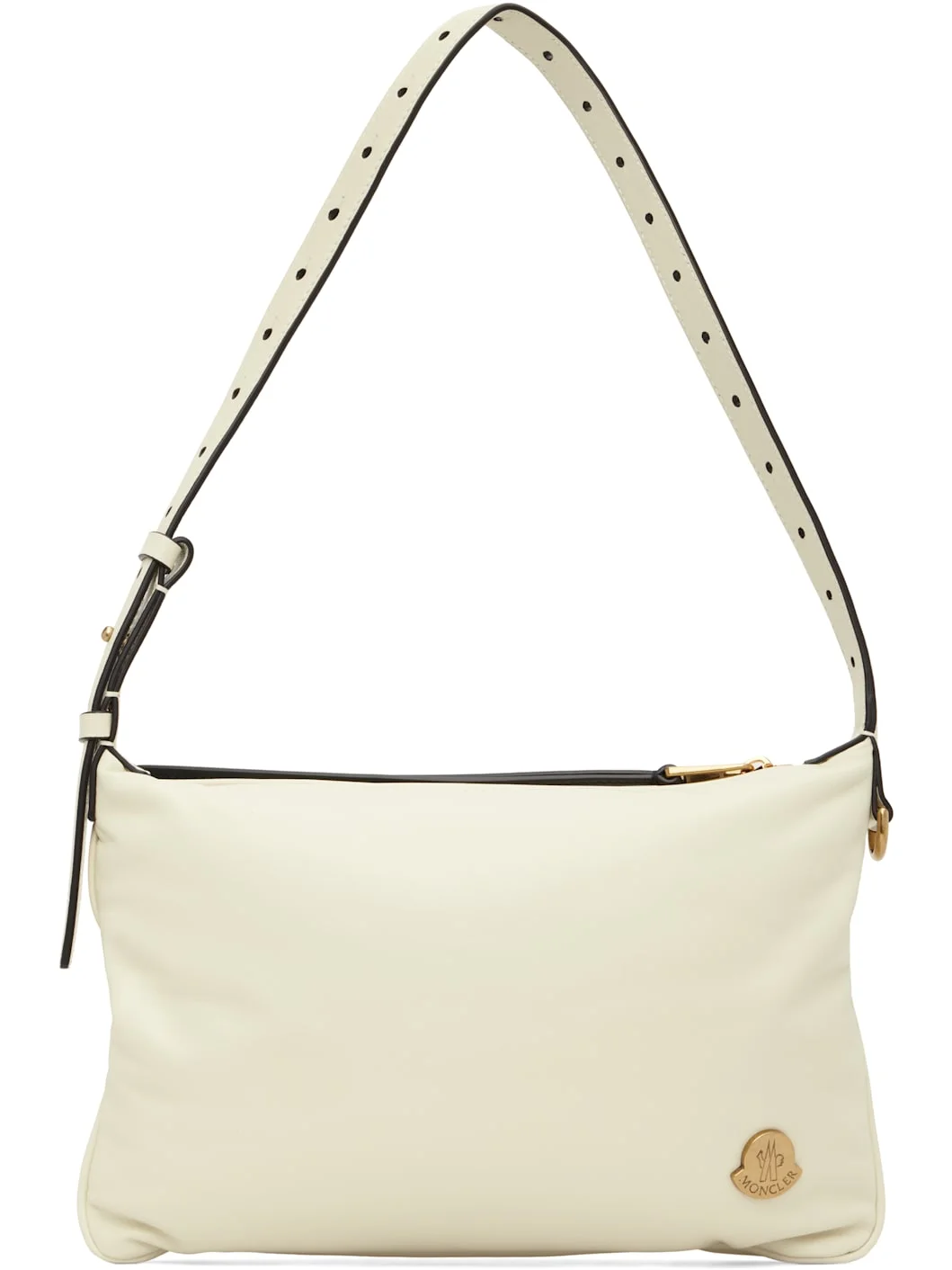 Down-filled buffed lambskin shoulder bag. · DIST-certified down · Adjustable shoulder strap · Logo hardware at face · D-ring at side · Logo embossed at back face · Zip closure · Patch pocket at interior · Nylon lacque lining · H7" x W11" x W3" Supplier color: White Fill: 90% goose down, 10% goose feather. Body: 100% lambskin. Lining: 100% polyamide. Made in Italy 252111F048001