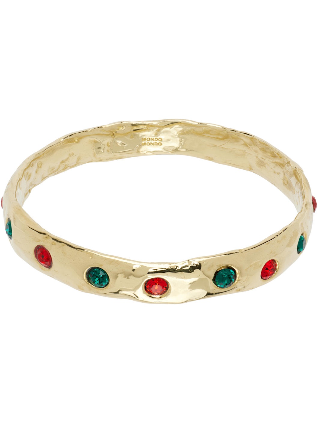 Cuff bracelet in gold-tone brass. · Hammered detailing throughout · Bezel-set glass crystals in green and red · D2.75" Supplier color: Red/Green Brass, glass. Made in United States 252416F020004