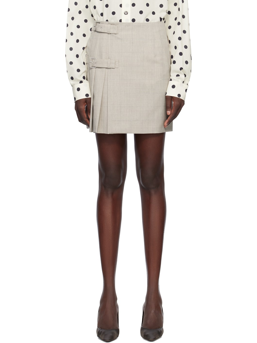 Virgin wool delaine miniskirt. Check pattern throughout. · Wrap construction · Button fastening at waist · Two-pocket styling · Pin-buckle straps at front · Knife pleats at front · Partially lined Supplier color: Multi/Beige Body: 100% virgin wool. Lining: 60% acetate, 40% cupro. Made in Italy 251720F090001