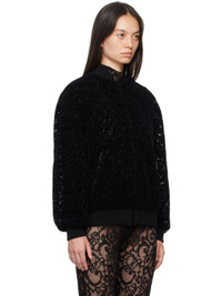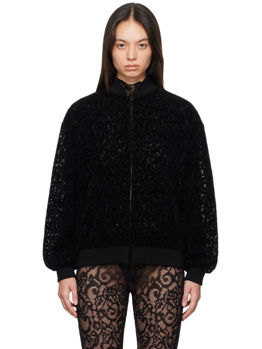 Semi-sheer cotton-blend devore velvet and lace bomber jacket. · Rib knit stand collar, hem, and cuffs · Zip closure · Zip pockets · Full tulle lining Supplier color: Black Body: 44% cotton, 36% viscose, 20% polyamide. Trim: 84% virgin wool, 15% polyamide, 1% elastane. Lining: 100% polyamide. Made in Italy 242720F058000