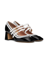 Patent leather Mary Jane-style heels in black. · Square toe · Serrated detailing at vamp · Pin-buckle straps at vamp · Logo stamp at padded footbed · Buffed leather and suede lining · Covered block heel with rubber injection · Leather sole · Heel: H2.25" Supplier color: Black patent