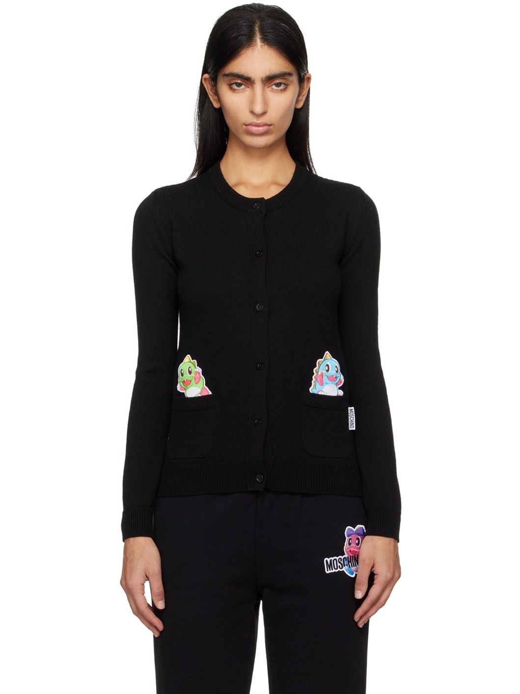 Knit virgin wool cardigan. · Rib knit crewneck, hem, and cuffs · Button closure · Graphic patch at patch pockets · Logo flag at patch pocket Part of the Moschino Pokemon capsule collection. Supplier color: Black 100% virgin wool. Made in Romania 241720F095000