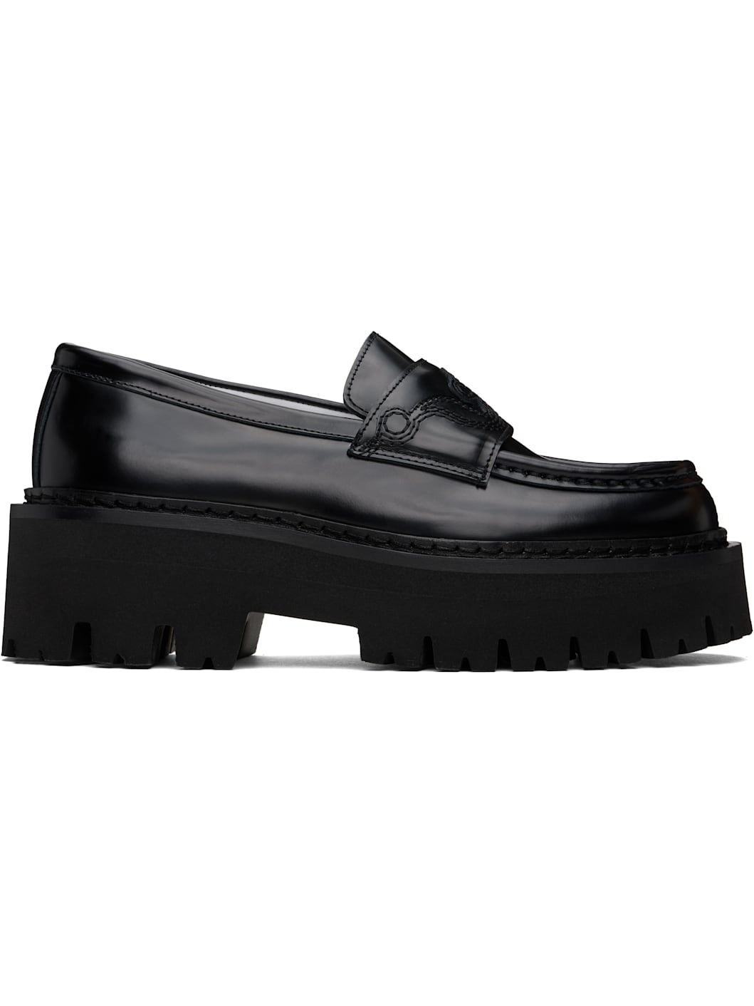 Buffed leather loafers in black. · Moc toe · Embroidered strap at vamp · Logo stamp at molded footbed · Foam rubber platform midsole · Treaded rubber sole · Platform: H1.5" · Heel: H2.25" Supplier color: Black