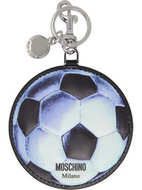 Keychain in silver tone. · Keyring and logo disc at top · Faux-leather charm at drop · Logo stamp at face · Graphic printed at face and back face · Lobster-clasp fastening · H6.5" x W3.75" Supplier color: One color Synthetic. Made in Italy 251720M148001