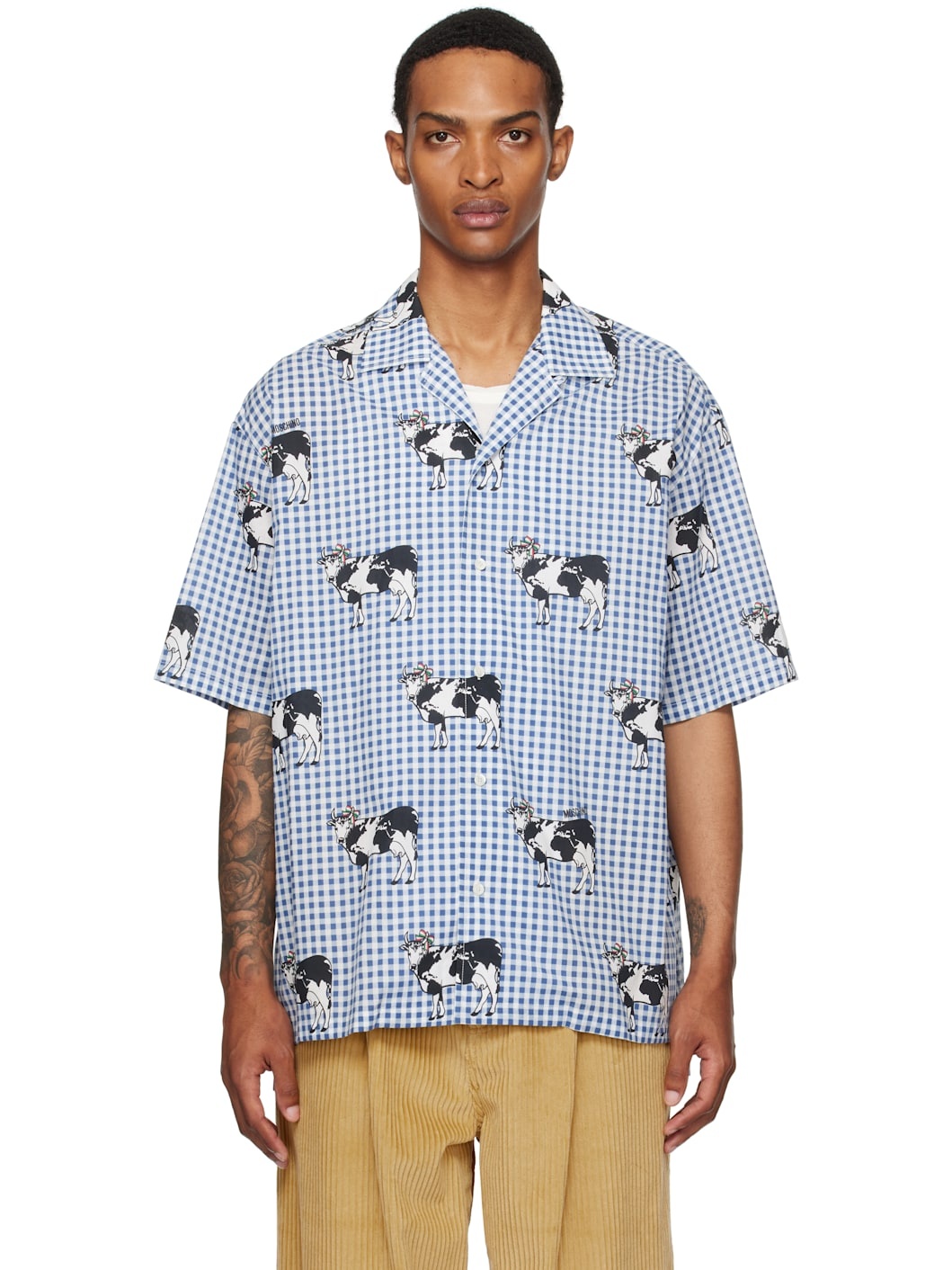 Cotton poplin shirt. · Check pattern and graphic printed throughout · Spread collar · Button closure · Logo printed at front and back · Droptail hem Supplier color: Azure 100% cotton. Made in Italy 252720M192002