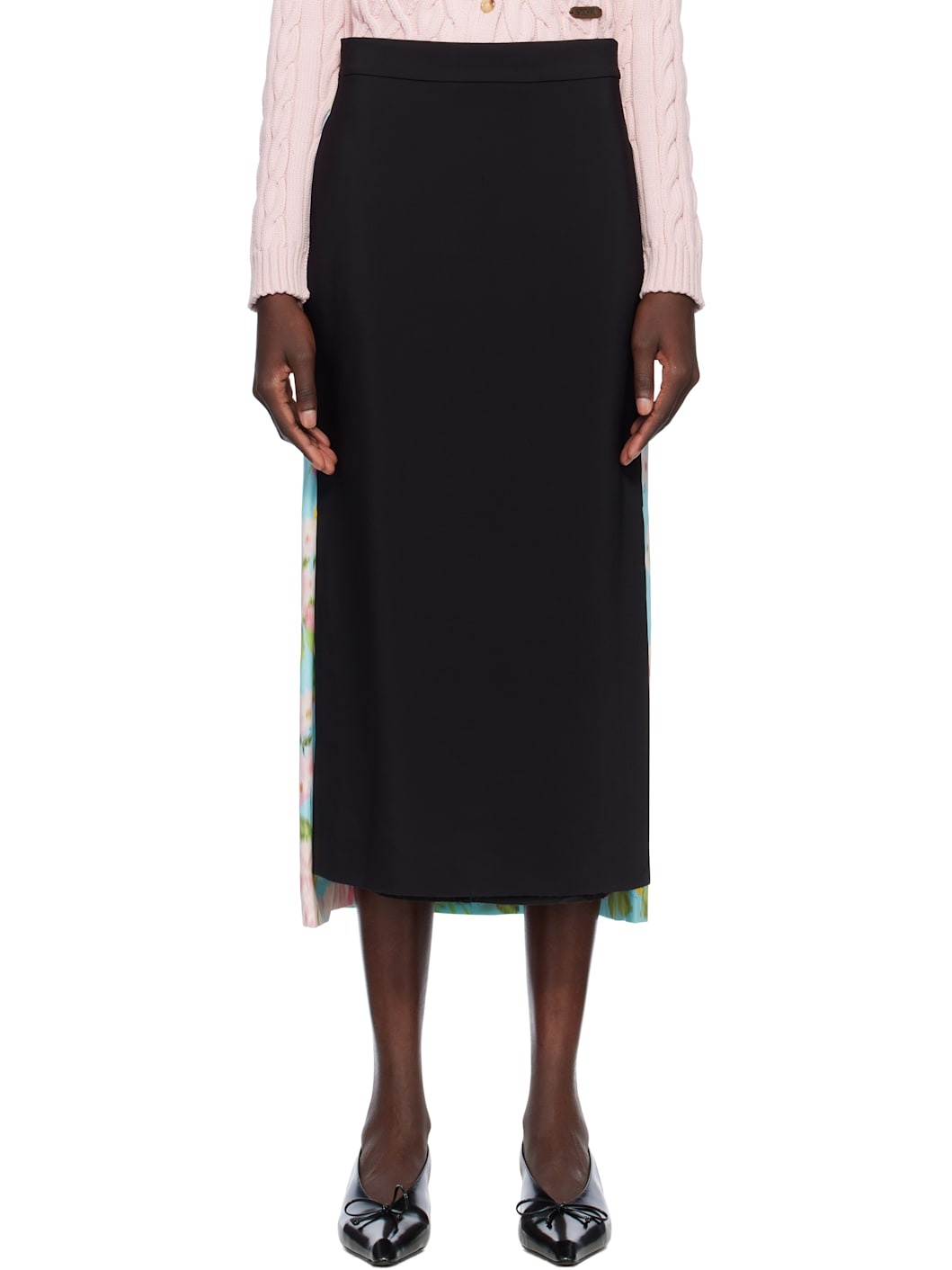 Stretch viscose crepe and silk satin midi skirt. · Paneled construction · Two-pocket styling · Raw edge at front hem · Concealed zip closure at side · Vented side seams · Logo graphic and floral pattern printed at back · Zip closure at back waist · Central slit at back hem Part of the Moschino Smiley® collection. Supplier color: Black Body 1: 94% viscose, 6% elastane. Body 2: 100% silk. Lining: 60% acetate, 40% cupro. Made in Italy 251720F092002