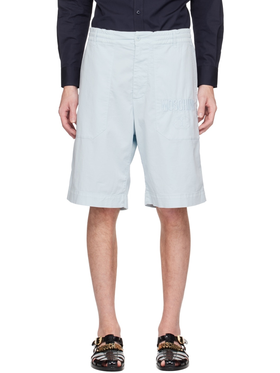Garment-dyed stretch cotton twill shorts. · Belt loops · Four-pocket styling · Zip-fly · Logo graphic embroidered at front Part of the Moschino x Smiley® collection. Supplier color: Light blue 98% cotton, 2% elastane. Made in Italy 231720M191007