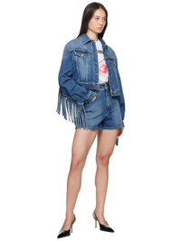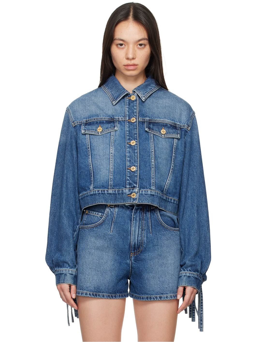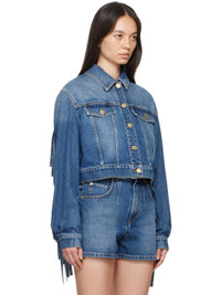 Non-stretch denim jacket. · Spread collar · Button closure · Flap pockets · Cropped hem · Fringe detailing at sleeves and back yoke · Single-button barrel cuffs · Adjustable button tabs at back hem · Logo-engraved gold-tone hardware · Contrast stitching in tan Supplier color: Blue Body: 100% cotton. 65% polyester, 35% cotton. Made in Italy 242720F060000
