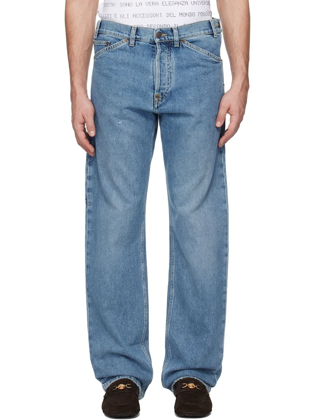Non-stretch denim jeans. Fading and subtle distressing throughout. · Belt loops · Button fastenings at waistband · Five-pocket styling · Zip fly · Leather logo patch at back waistband · Patch pocket at back · Logo-engraved bronze-tone hardware · Contrast stitching in tan Supplier color: Blue Body: 100% cotton. Lining: 65% polyester, 35% cotton. Made in Italy 251720M186000