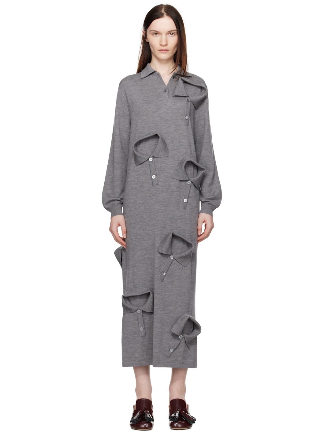 Knit merino wool maxi dress. Spread collar-style appliques throughout. · Rib-knit spread collar, hem, and cuffs · Two-button placket Supplier color: Grey 100% merino wool. Made in Romania 251720F055002