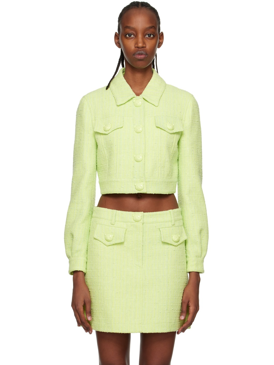 Cotton- and nylon-blend tweed jacket. · Spread collar · Press-stud closure · Flap pockets · Cropped hem · Single-button barrel cuffs · Full cotton poplin lining · Graphic hardware Supplier color: Green Body: 82% cotton, 18% polyamide. Lining 1: 100% cotton. Lining 2: 60% acetate, 40% cupro. Made in Italy 231720F063006