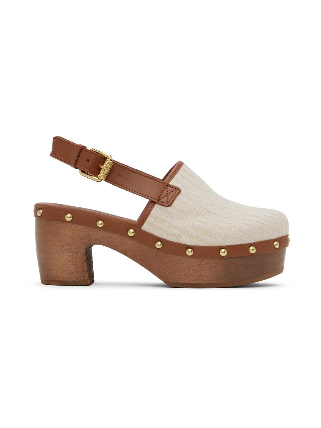 Plain-woven cotton-blend canvas mules in off-white. · Jacquard logo pattern and calfskin trim throughout · Pin-buckle slingback strap · Logo stamp at padded leather footbed · Rivets at welt · Wooden sole with rubber injection · Platform: H1.5" · Heel: H2.5" Supplier color: Ivory Upper: calfskin, textile. Sole: rubber. Made in Italy 241720F121002