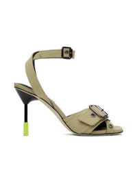 Canvas heeled sandals in beige. · Eyelets throughout · Open square toe · Pin-buckle strap at vamp · Criss-crossing pin-buckle ankle strap · Logo patch at padded leather footbed · Buffed leather lining · Stiletto heel with rubber injection · Nubuck lining · Heel: H3.75" Supplier color: Beige Upper: textile. Sole: leather, rubber. Made in Italy 241443F125001