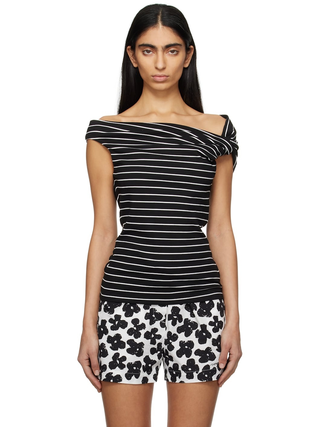 Knit stretch viscose-blend blouse. Stripes throughout. · Off-the-shoulder construction · Twisted detailing at asymmetric neck · Logo patch at back collar Supplier color: Black 83% viscose, 14% polyamide, 3% elastane. Made in Italy 251443F107003