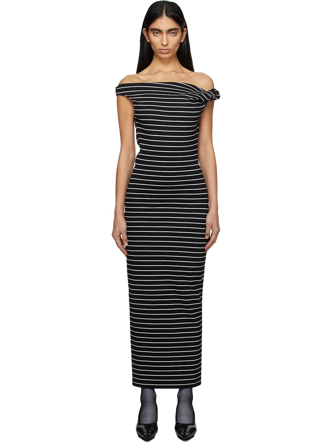 Knit stretch viscose-blend midi dress. Stripes throughout. · Off-the-shoulder construction · Twisted detailing at asymmetric neck · Logo patch at back collar Supplier color: Black 83% viscose, 14% polyamide, 3% elastane. Made in Italy 251443F054002