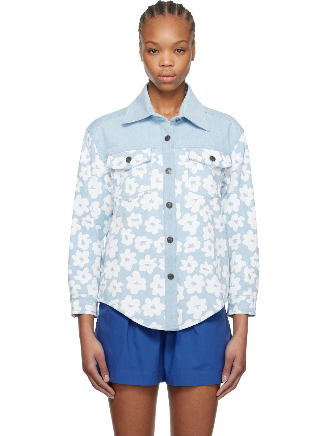 Non-stretch denim shirt. Floral pattern printed throughout. · Spread collar · Button closure · Flap pockets · Shirttail hem · Pleats at single-button barrel cuffs · Logo embroidered at back collar Supplier color: Light blue 100% cotton. Made in Italy 251443F109000