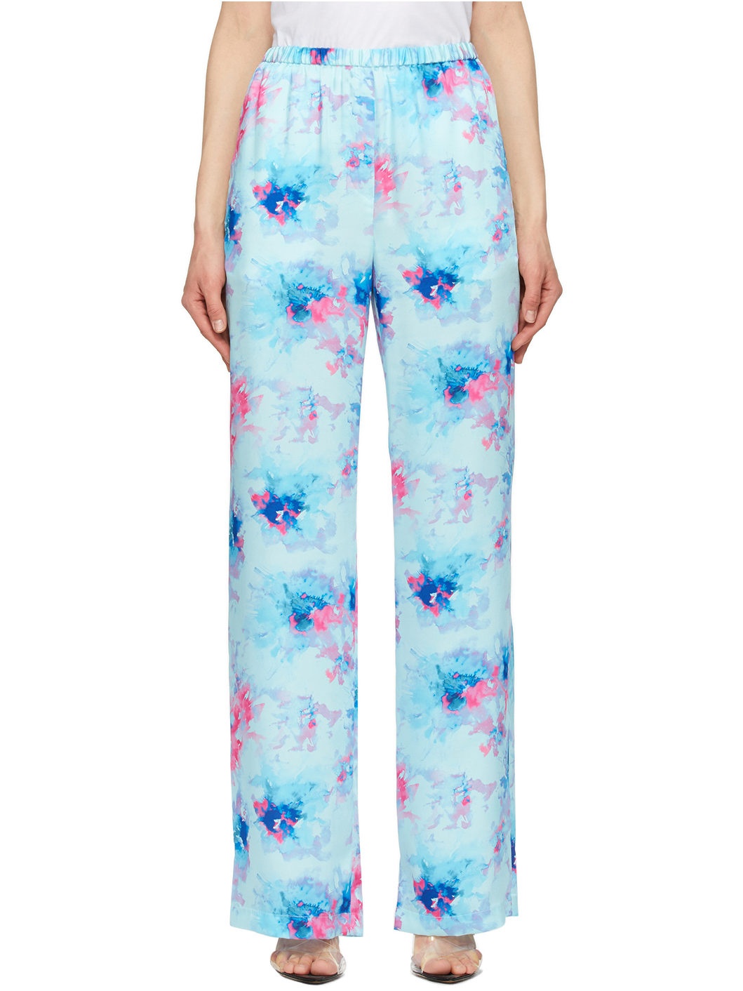 Flared satin lounge pants in blue featuring tonal and pink tie-dye pattern printed throughout. High-rise. Two-pocket styling. Elasticized waistband. Supplier color: Light blue 100% polyester. Made in Italy 211443F087002