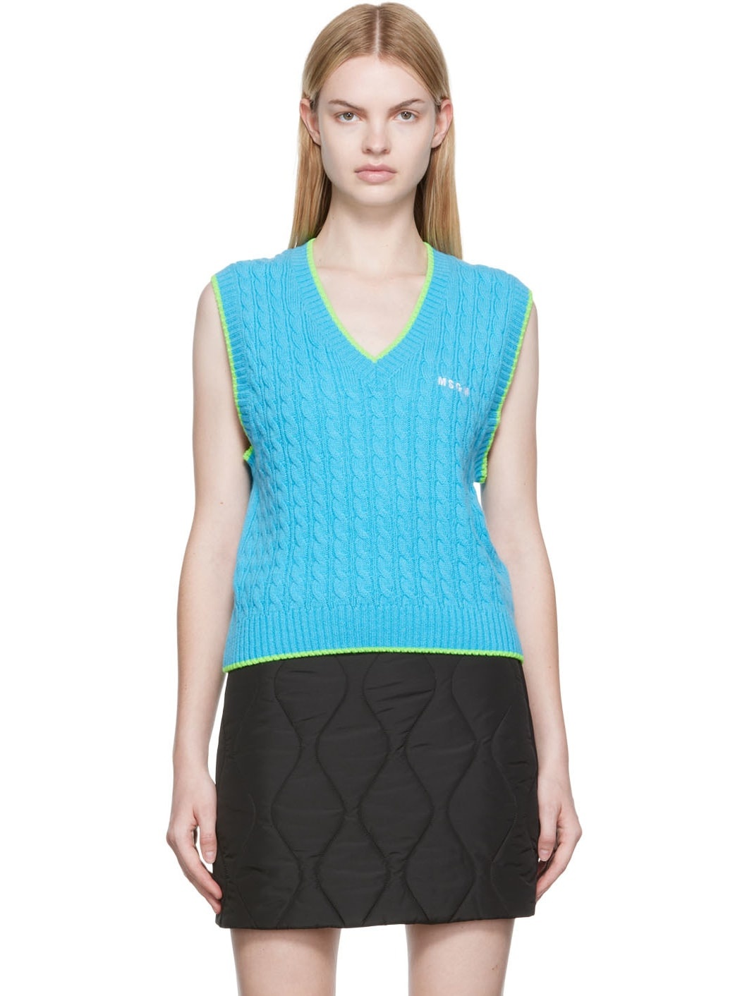 Cable knit wool and cashmere-blend vest. · Rib knit v-neck, armscyes, and hem · Logo embroidered at chest Supplier color: Turquoise 70% wool, 30% cashmere. Made in Italy 222443F100000
