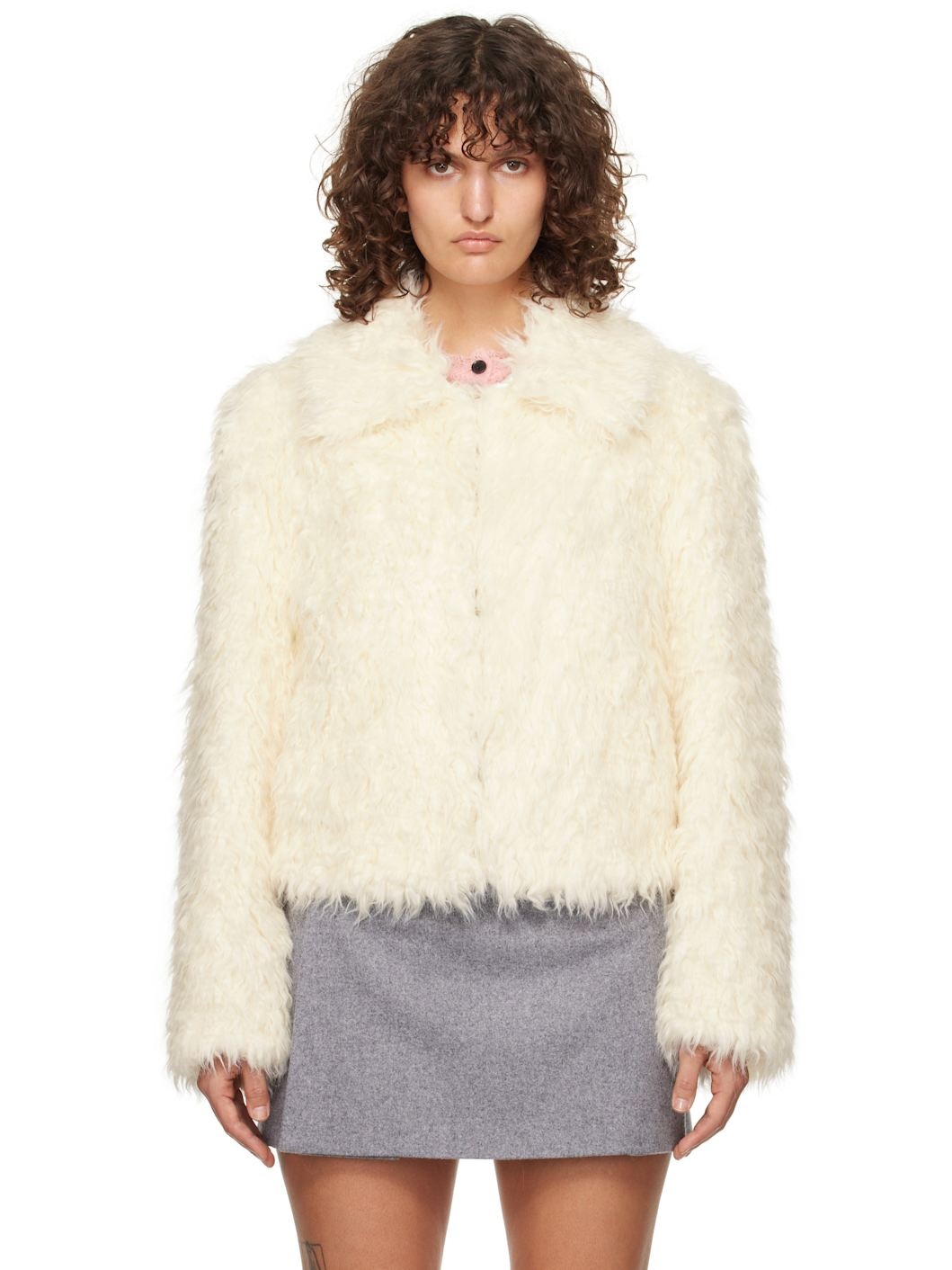 Faux-fur jacket. · Spread collar · Hook-eye closure · Welt pockets · Full logo-woven satin lining Supplier color: Off-white Body: 57% modacrylic, 25% acrylic, 18% polyester. Lining: 100% viscose. Made in Italy 242443F063001