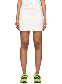 Stretch denim miniskirt in white featuring logo printed in pink at back pocket. · Mid-rise · Five-pocket styling · Zip-fly Supplier color: White 99% cotton, 1% elastane.