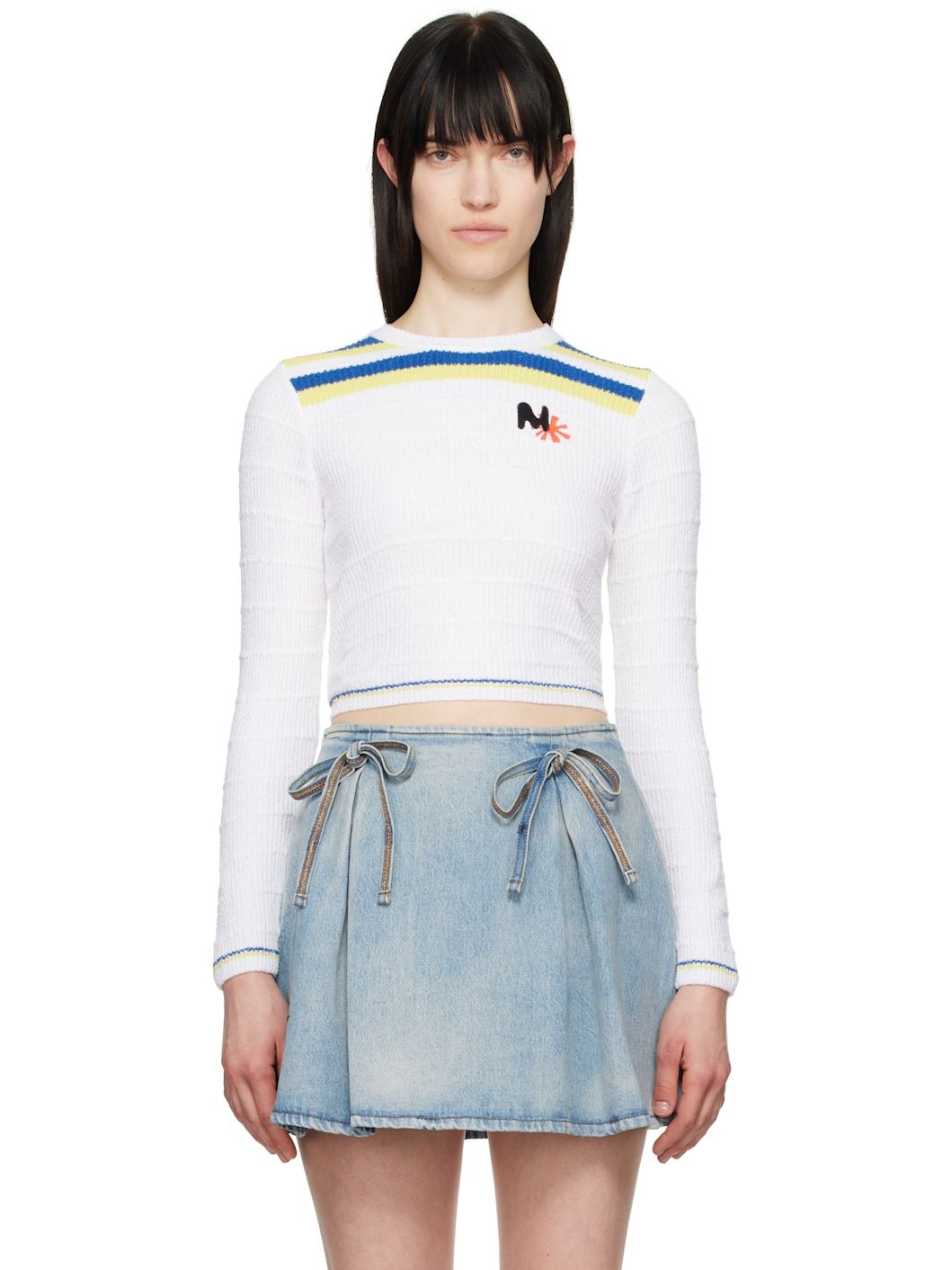 Rib-knit cotton-blend boucle sweater. Stripes throughout. · Crewneck · Logo graphic embroidered at chest · Logo embroidered at back Supplier color: White 78% cotton, 22% polyamide. Made in Italy 251443F096002