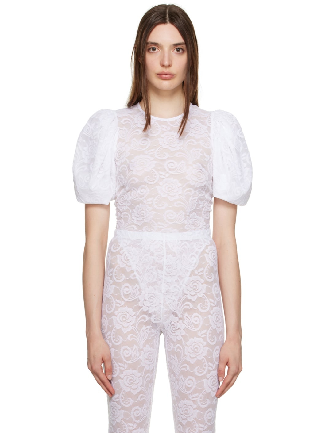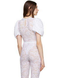 Semi-sheer stretch nylon lace bodysuit. · Crewneck · Hook-eye closure at bottom · Puff sleeves · Elasticized cuffs · Buttoned keyhole at back collar Supplier color: White 92% polyamide, 8% elastane. Made in Italy 231443F358000