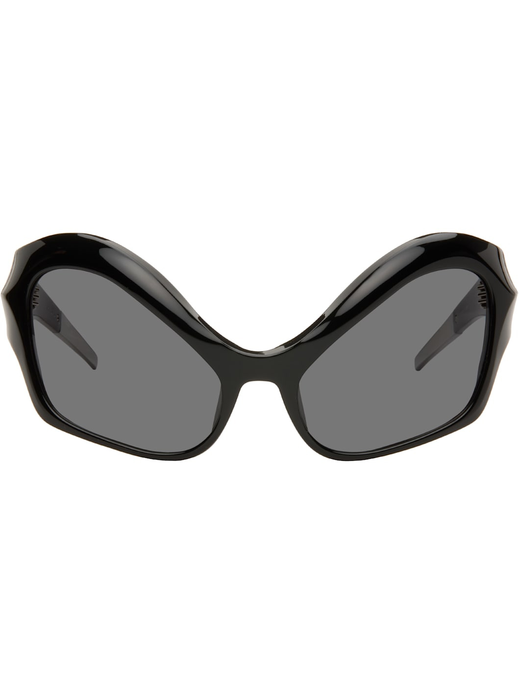 Modified cat-eye acetate-frame sunglasses. · Integrated nose pads · Black lenses with 100% UVA/UVB protection · Logo etched at temples · Hardware at temple tips · Titanium hardware · Logo-embossed squeeze-top pouch · Size: 58.20 120 Supplier color: Black Acetate. Made in Japan 252345F005000