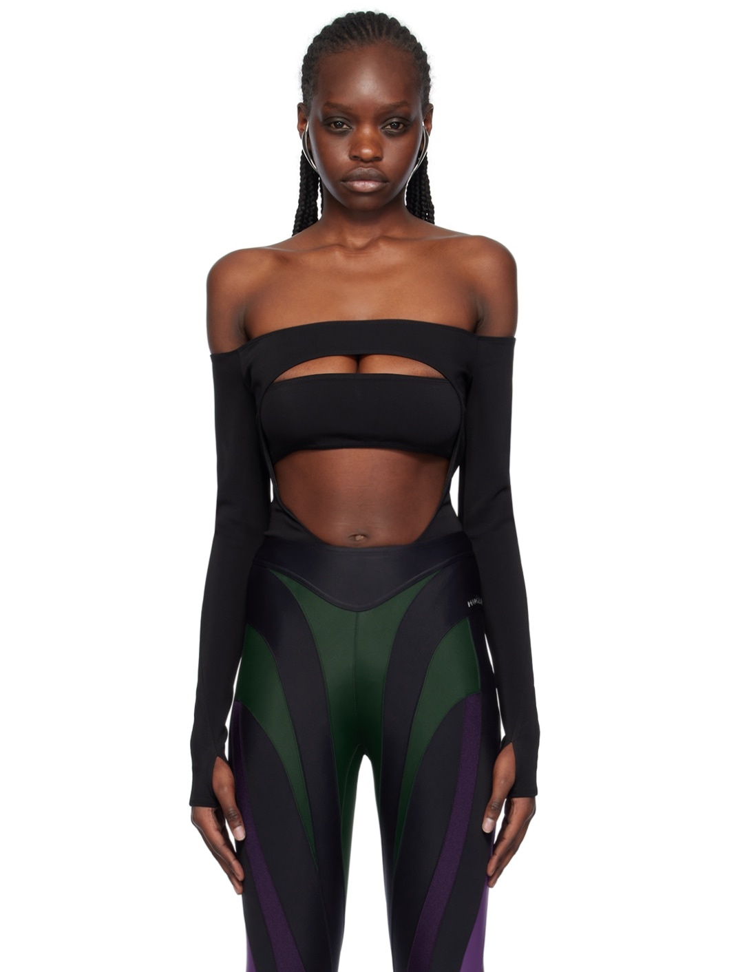 Stretch viscose crepe bodysuit. · Off-the-shoulder construction · Cutouts at front · Press-stud fastening at bottom · Concealed zip closure at back · Partial cotton jersey lining Supplier color: Black Body: 96% viscose, 4% elastane. Lining: 100% cotton. Made in Portugal 241345F358011