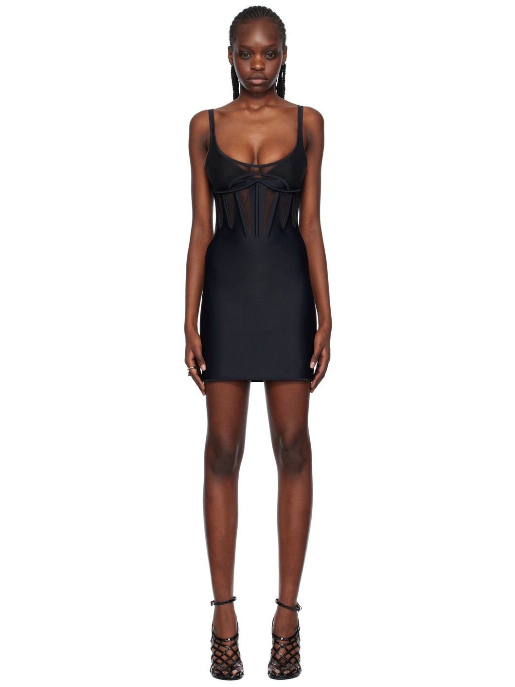Stretch nylon bonded jersey and sheer stretch nylon mesh dress. · V-neck · Cutout and boning at front · Adjustable hook-eye strap at back · Concealed zip closure at back Supplier color: Black Body 1: 78% polyamide, 22% elastane. Body 2: 83% polyamide, 17% elastane. Made in Portugal 241345F052006