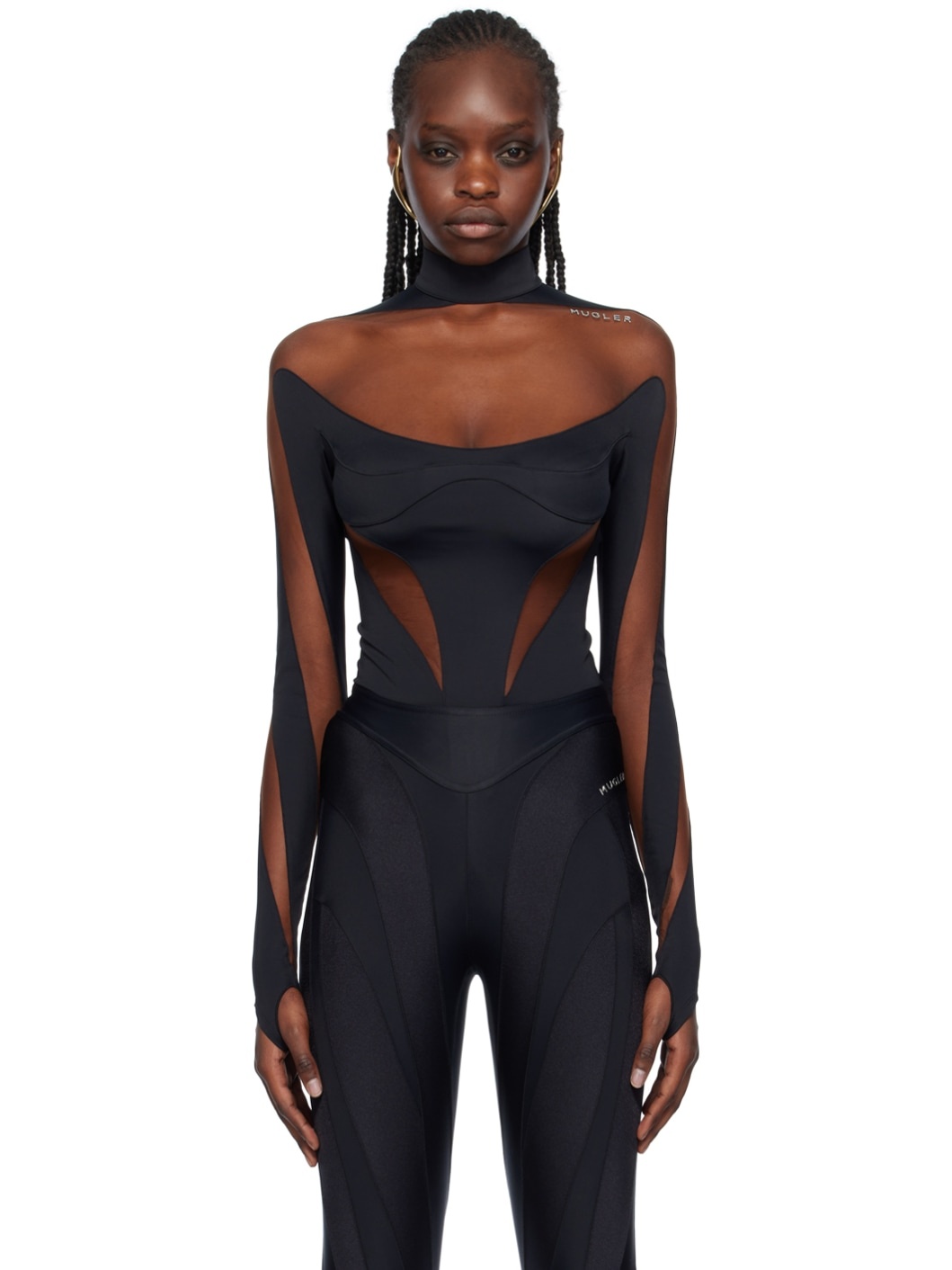Stretch nylon jersey and sheer stretch nylon mesh bodysuit. · Mock neck · Rubberized logo applique at front · Press-stud fastening at bottom · Thumbhole at cuffs · Concealed zip closure at back · Partial cotton jersey lining Supplier color: Black Body 1: 78% polyamide, 22% elastane. Body 2: 77% polyamide, 23% elastodiene. Lining: 100% cotton. Made in Portugal 241345F358028