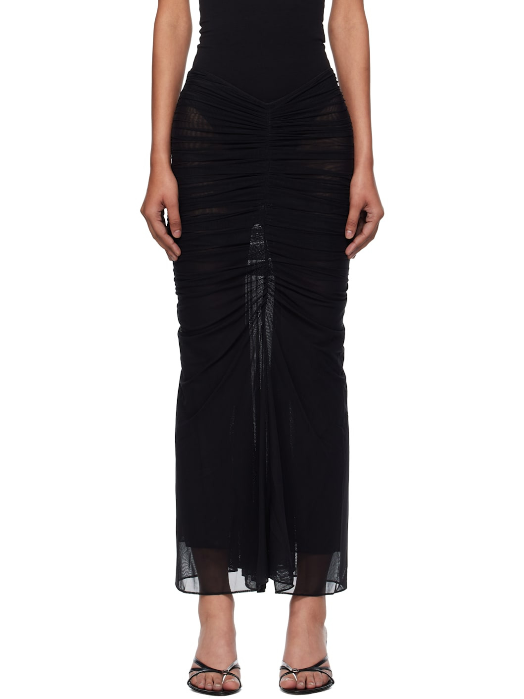 Stretch recycled nylon mesh midi skirt. · Ruching throughout · Elasticized waistband · Full stretch cotton jersey lining Supplier color: Black Body: 94% recycled polyamide, 6% elastane. Lining: 89% cotton, 11% elastane. Made in Tunisia 252345F092000