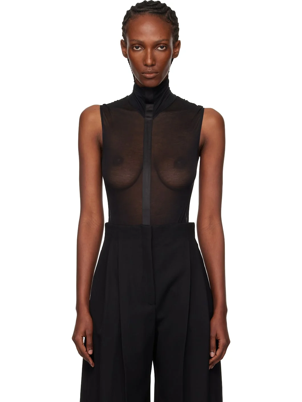 Lightweight lyocell- and silk-blend jersey bodysuit. · Sheer · Mock neck · Satin stripe applique at front · Loop at back collar · Press-stud closure at bottom Supplier color: Black 90% lyocell, 10% silk. Made in Portugal 261345F358000