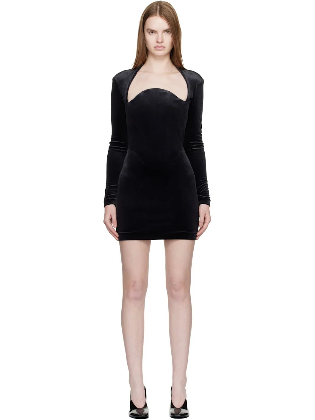 Stretch velour minidress. · Boning throughout · Modified scoop neck · Zip closure at back · Hook-eye fastening at interior bodice · Partial jersey lining Supplier color: Black Body: 91% polyester, 9% elastane. Trim: 83% polyamide, 17% elastane. Lining: 100% polyamide. Made in Bulgaria 252345F052008