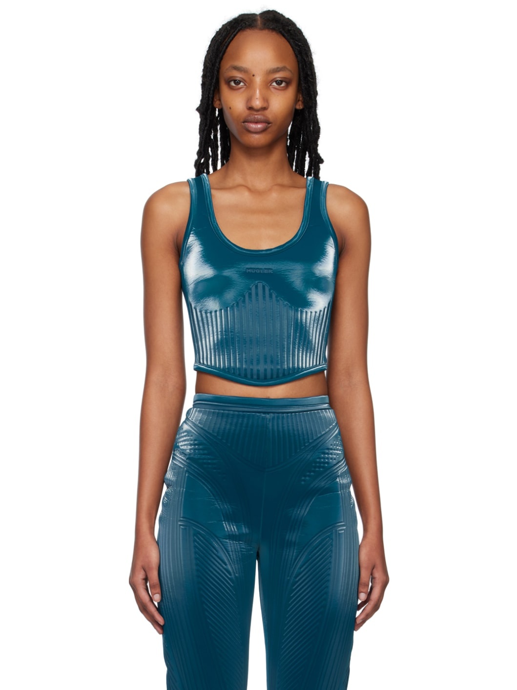 Polyurethane-coated stretch polyester jersey tank top. Corset-style pattern embossed throughout. · Scoop neck · Logo embossed at chest · Curved cropped hem · Fixed shoulder straps · Concealed zip closure at side seam · Bonded jersey lining Supplier color: Teal 64% polyester, 31% polyurethane, 5% elastane. Made in Portugal 222345F111007