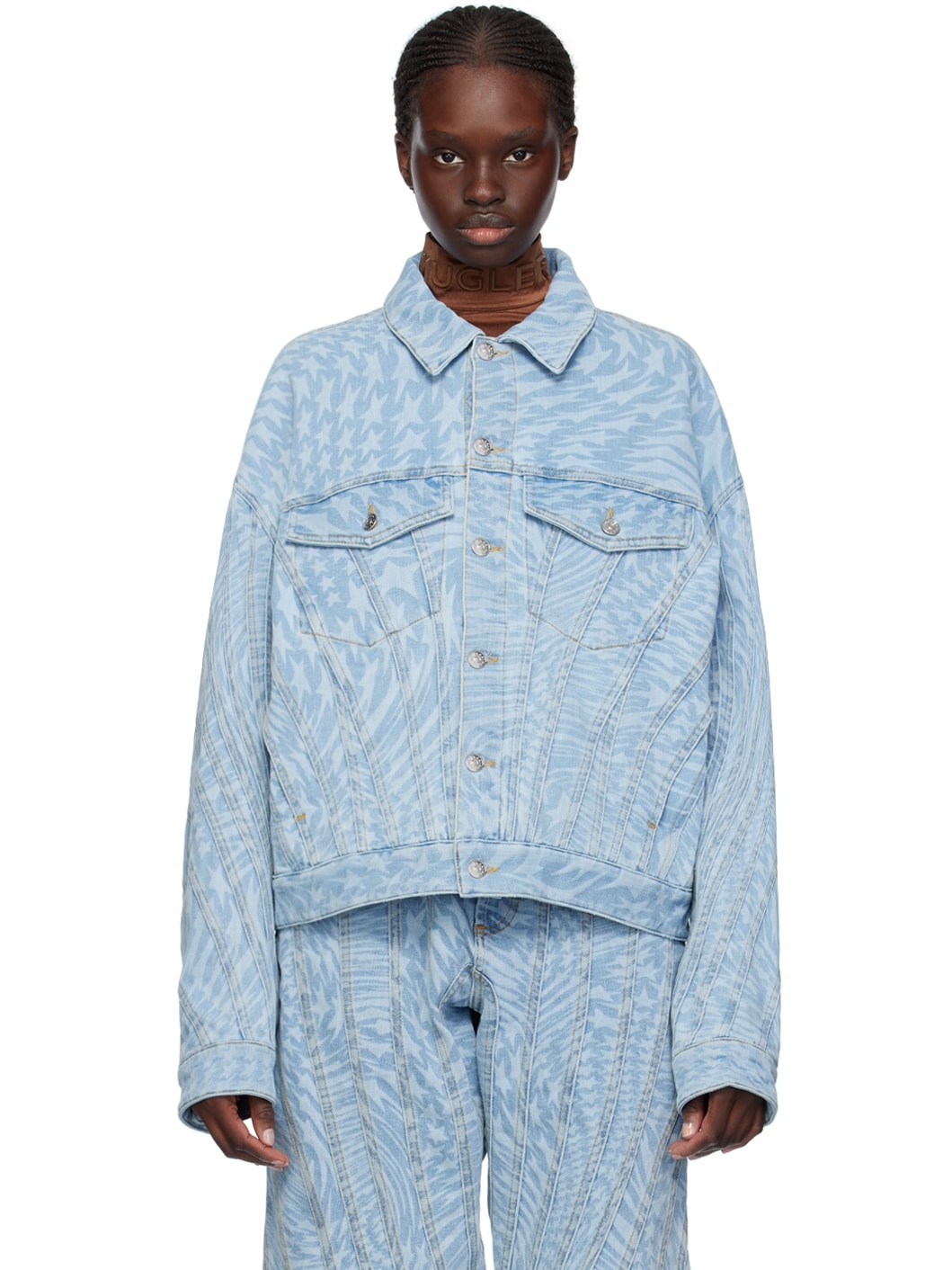 Stretch denim jacket. Graphic pattern laser-printed throughout. · Paneled construction · Spread collar · Button closure · Flap and welt pockets · Single-button barrel cuffs · Adjustable button tabs at back hem · Leather logo patch at back hem · Patch pocket at interior · Contrast stitching in yellow · Logo-engraved silver-tone hardware Supplier color: Laser printed star 72% cotton, 28% elastomultiester. Made in Italy 241345F060007