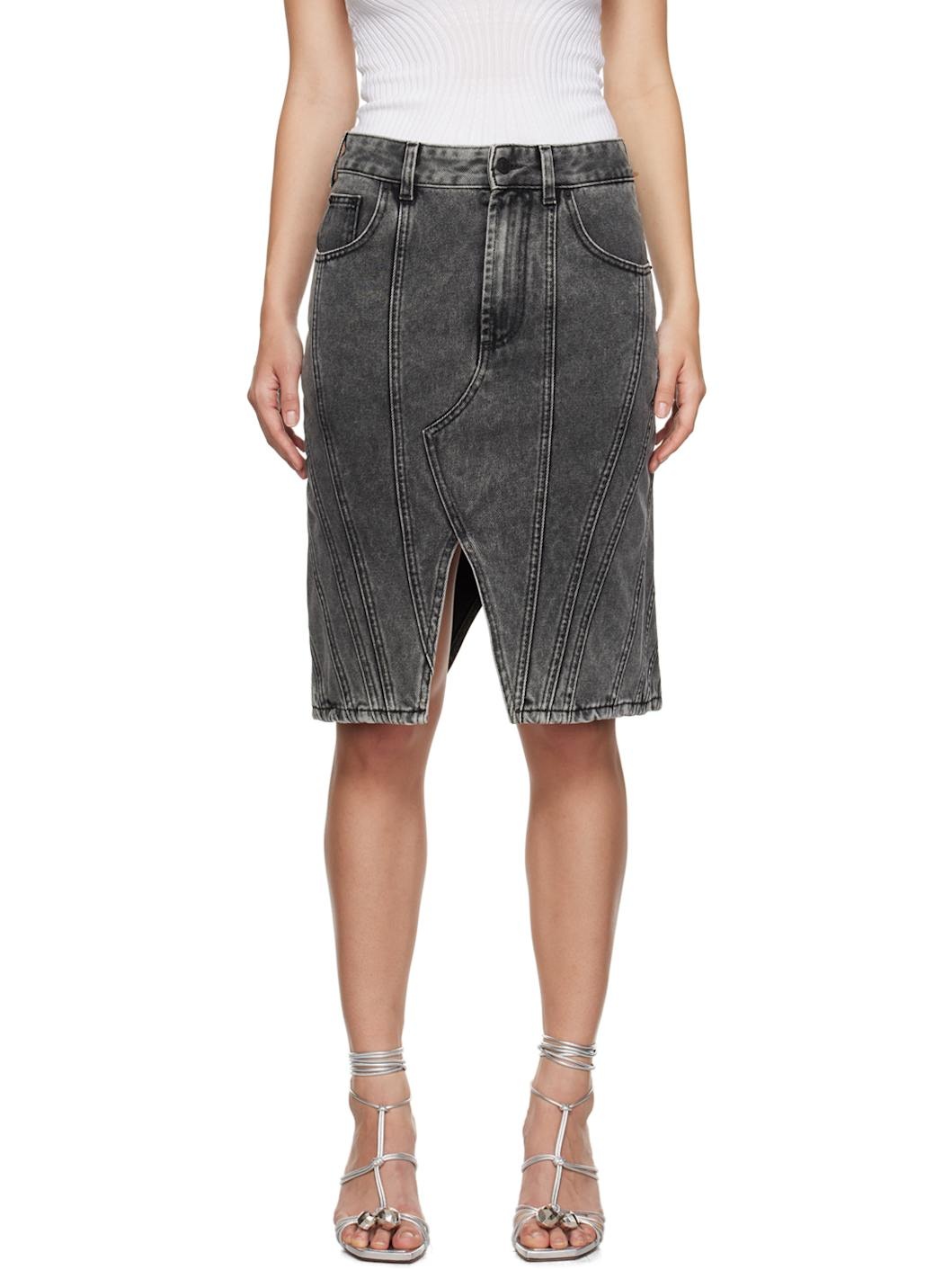 Non-stretch organic cotton denim skirt. Fading throughout. · Paneled and asymmetric construction · Belt loops · Five-pocket styling · Zip-fly · Central vent at front and back hem · Leather logo patch at back waistband · Logo-engraved black hardware Supplier color: Washed black Body: 100% organic cotton. Lining: 65% polyester, 35% cotton. Made in Italy 242345F090000