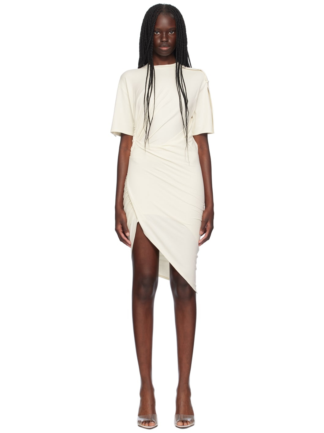 Stretch cotton jersey dress. Draping throughout. · Rib knit crewneck · Asymmetric hem · Ruching at side seam · Tuck at shoulders and sleeves · Graphic hardware at shoulder Supplier color: Off white Body: 91% cotton, 9% elastane. Trim: 94% cotton, 6% elastane. Made in Portugal 242345F052011