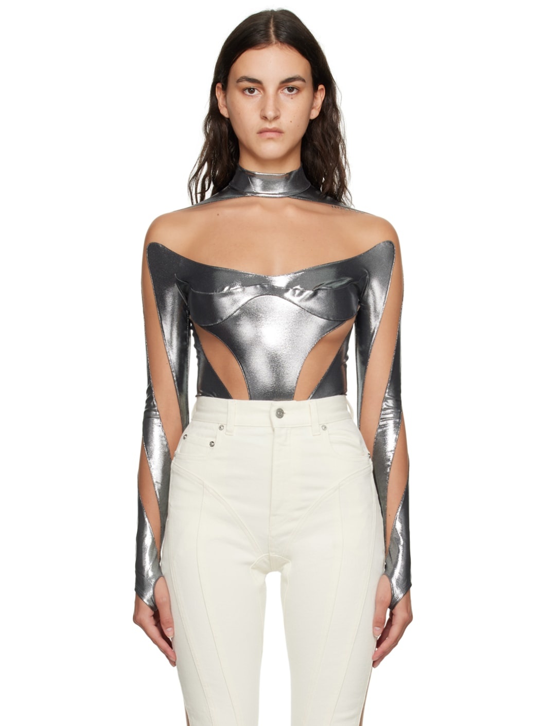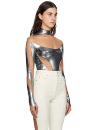 Semi-sheer stretch nylon jersey and tulle bodysuit. · Mock neck · Logo bonded at chest · Press-stud closure at bottom · Thumbhole at cuffs · Zip closure at back · Partial cotton jersey lining Supplier color: Chrome Body 1: 78% polyamide, 22% elastane. Body 2: 77% polyamide, 23% elastodiene. Lining: 100% cotton. Made in Portugal 232345F358070