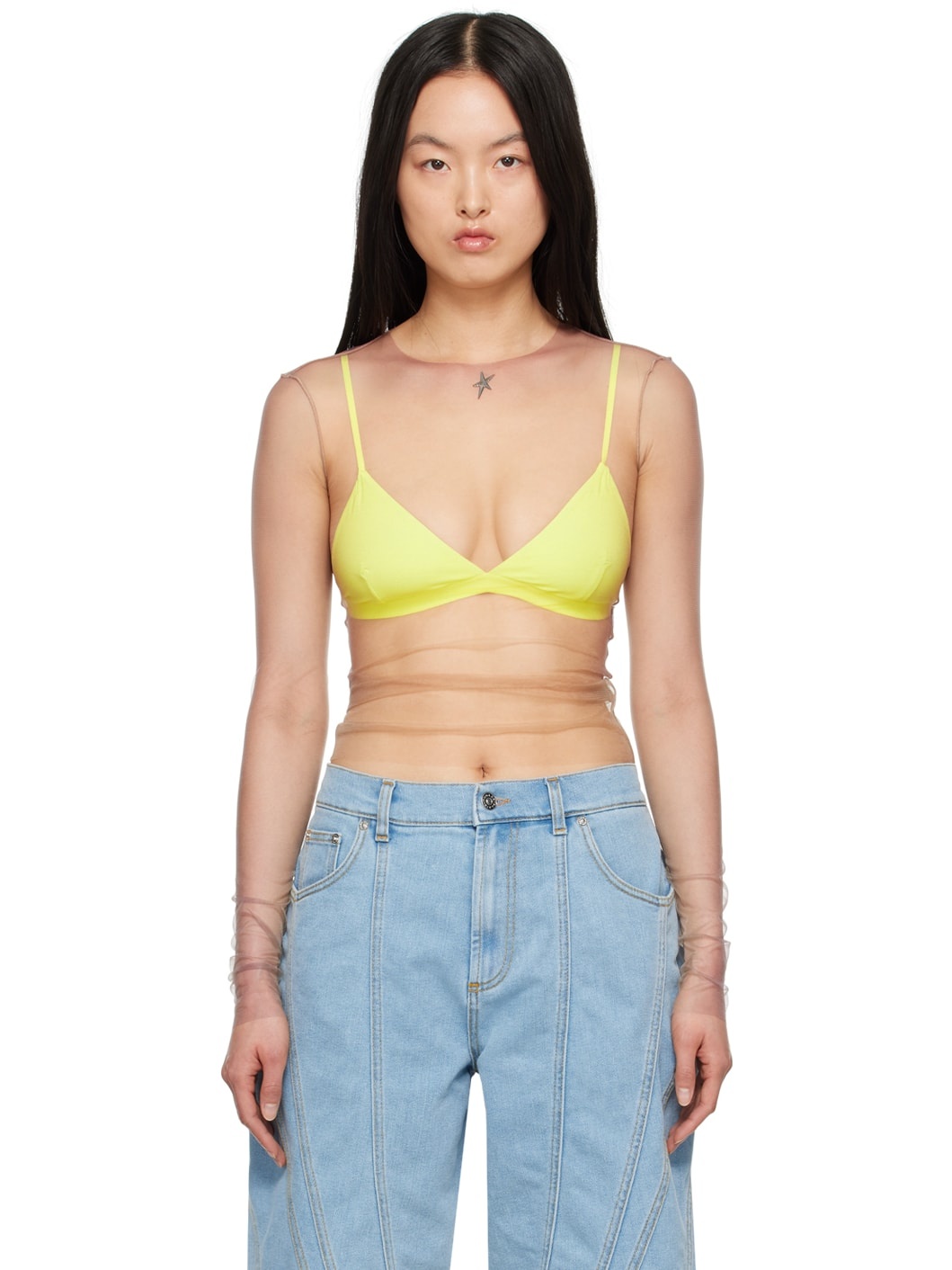 Sheer stretch nylon mesh T-shirt. Gradient printed throughout. · Raw edge at crewneck, hem, and cuffs · Logo hardware at front Supplier color: Tan 77% polyamide, 23% elastodiene. Made in Portugal 241345F110033