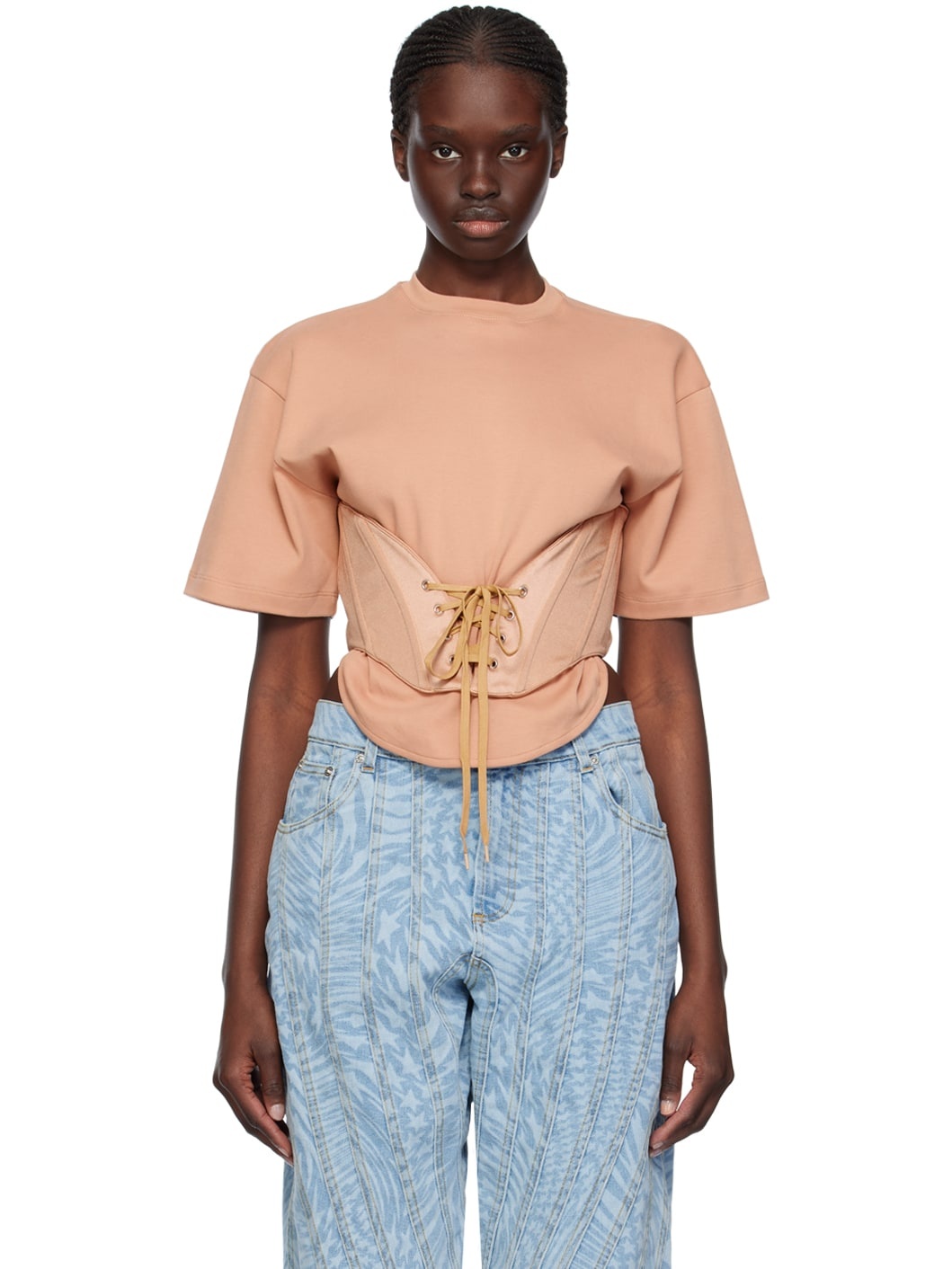 Cotton jersey T-shirt. · Rib knit crewneck · Stretch nylon jersey trim at hem · Boning and lace-up detailing at hem · Gathering at back hem Supplier color: Tan/Tan Body 1: 100% cotton. Body 2: 80% polyamide, 20% elastane. Made in Portugal 241345F110028