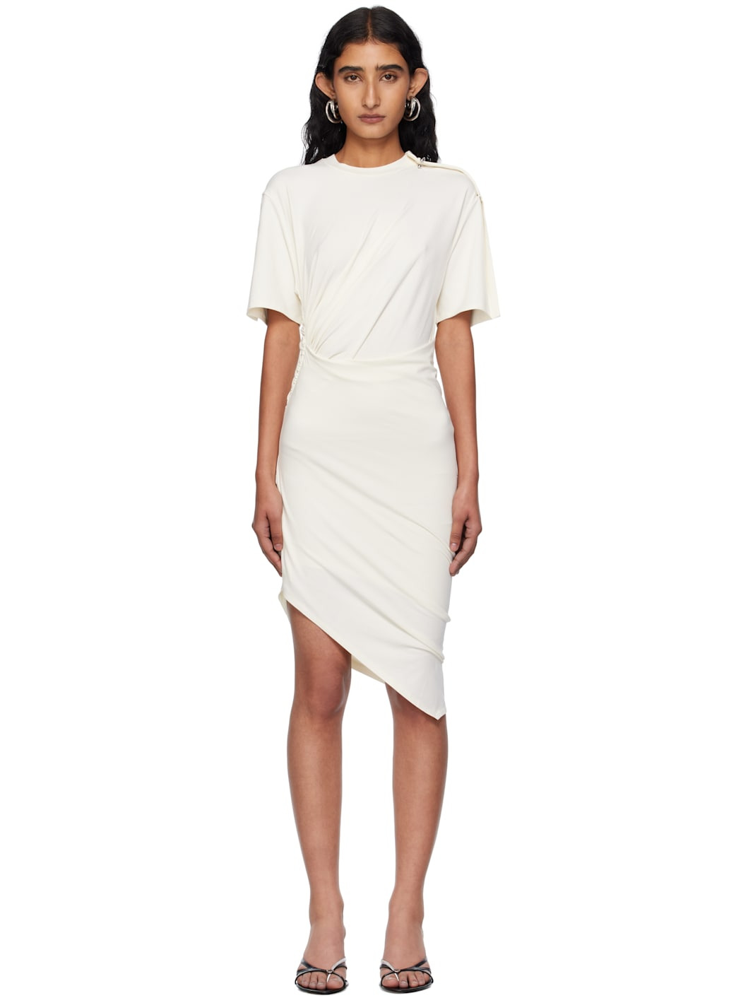 Stretch cotton jersey minidress. · Draped construction · Graphic hardware at rib-knit crewneck · Asymmetrical hem · Ruching at side · Folded panel at shoulder Supplier color: Snow 91% cotton, 9% elastane. Made in Portugal 252345F052001