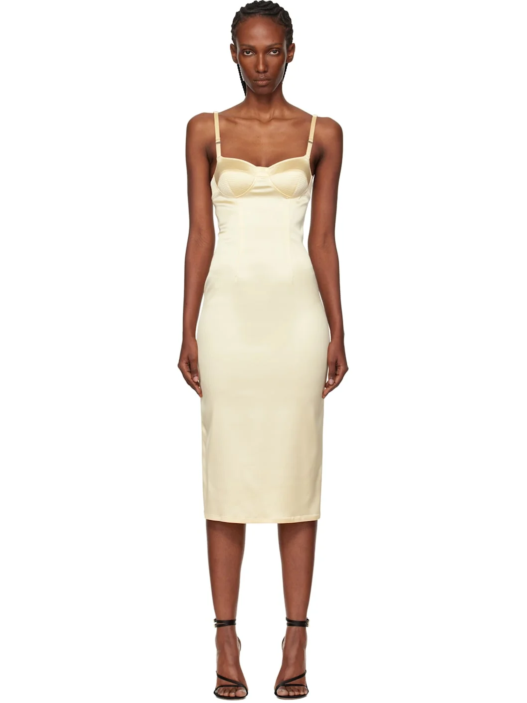 Stretch satin midi dress. · V-neck · Quilted and padded cups · Adjustable spaghetti shoulder straps · Princess seams at front · Zip closure with hook eye at back Supplier color: Butter 74% acetate, 23% nylon, 3% elastane. Made in Portugal 261345F054001