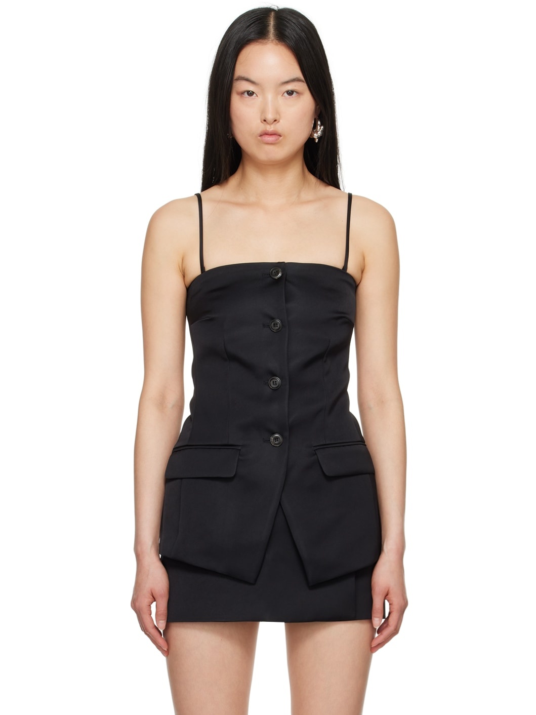 Polyester-blend satin vest. · Straight neck · Button closure · Darts at chest · Princess seams at front and back · Flap pockets · Asymmetric hem · Adjustable and detachable spaghetti straps · Vent at back hem · Full satin twill lining Supplier color: Black Body: 61% polyester, 39% triacetate. Lining: 100% viscose. Made in Hungary 241845F107000
