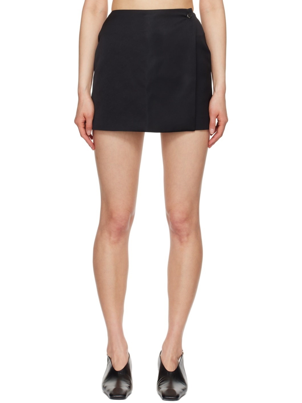 Polyester-blend satin skort. · Wrap construction · Button fastening at waist · Two-pocket styling · Concealed zip closure · Darts at back waistband Supplier color: Black 61% polyester, 39% triacetate. Made in Hungary 241845F090007