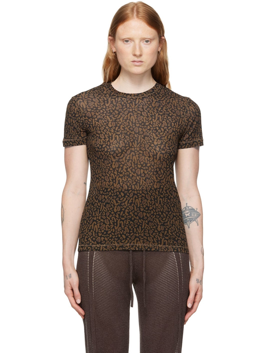 Semi-sheer recycled polyester jersey T-shirt. · Crewneck · Graphic pattern printed throughout Supplier color: Brown ocelot 100% recycled polyester. Made in Hungary 221845F110003