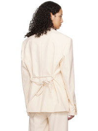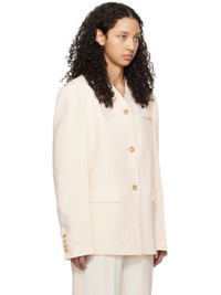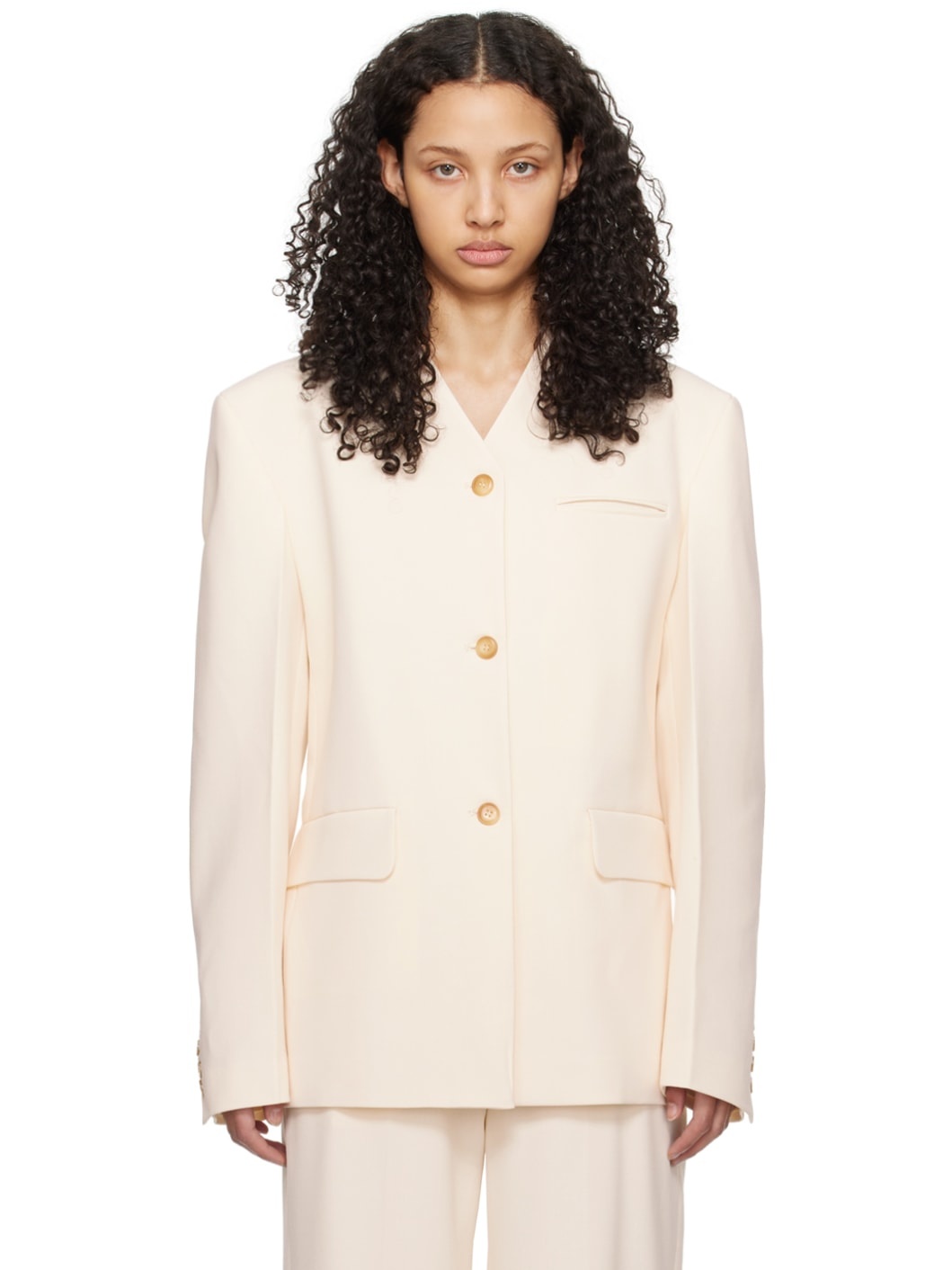 Stretch polyester- and viscose-blend crepe blazer. · V-neck · Three-button closure · Welt and flap pockets · Detachable self-tie belt at waist · Dropped padded shoulders · Four-button surgeon's cuffs · Central vent at back hem · Logo-engraved hardware · Full viscose twill lining Supplier color: Creme Body: 68% polyester, 29% viscose, 3% elastane. Lining: 100% viscose. Made in Hungary 241845F057002