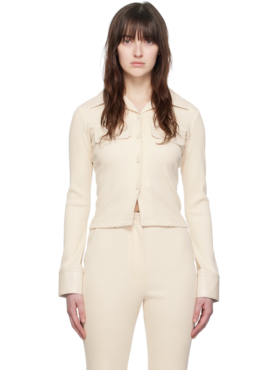 Organic cotton ribbed jersey shirt. Buffed regenerated leather trim throughout. · Open spread collar · Button closure · Mock flap pockets · Single-button barrel cuffs · Regenerated leather-covered hardware Supplier color: Creme Body 1: 100% organic cotton. Body 2: 100% polyurethane. Trim: 100% regenerated leather. Made in Hungary 241845F063002