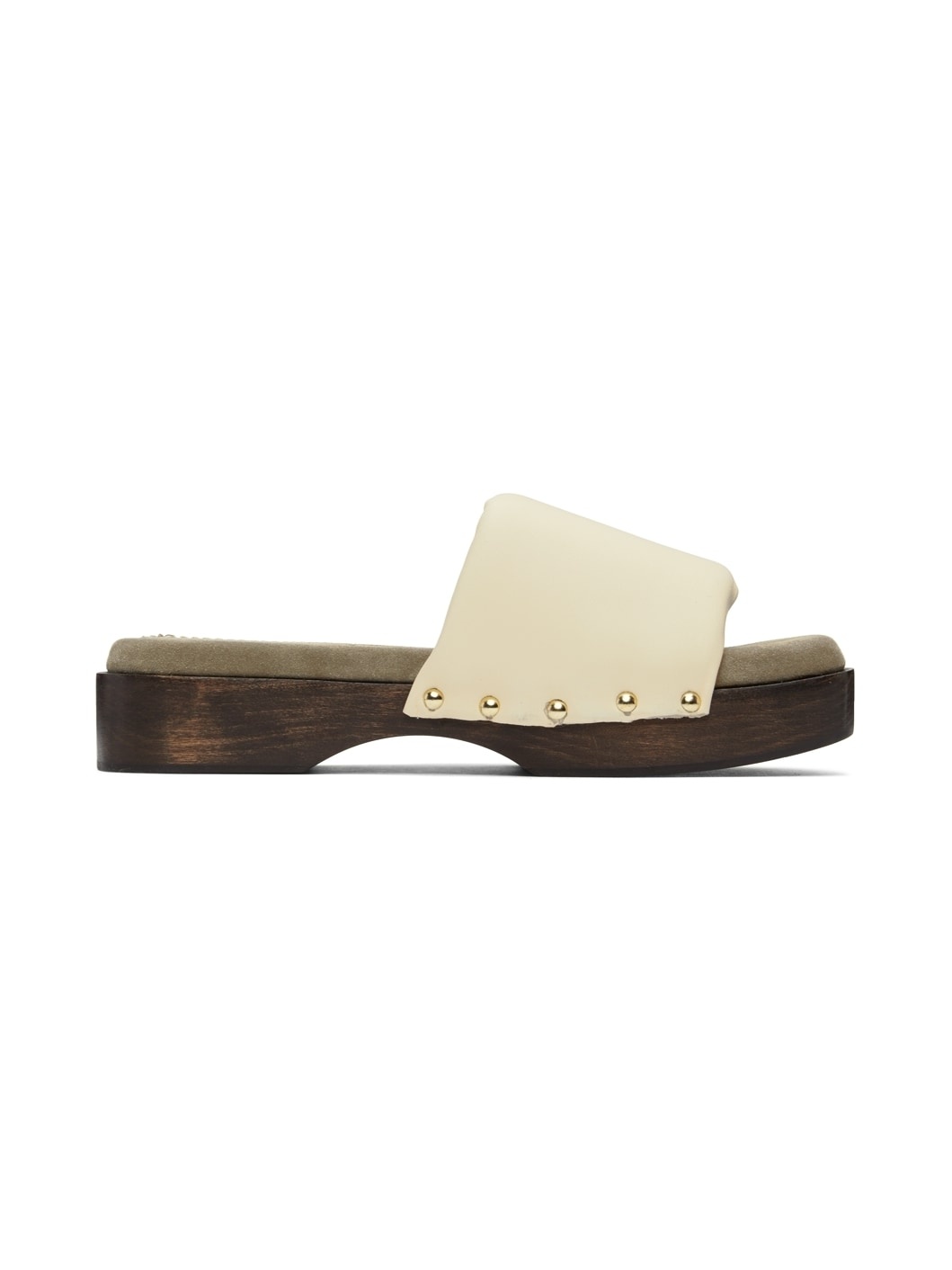 Grained faux-leather slip-on sandals in off-white. · Padded strap at vamp · Studs at sides · Padded faux-suede footbed · Wood midsole · Rubber sole Supplier color: Creme Upper: synthetic. Sole: wood, rubber. Made in Italy 221845F124002