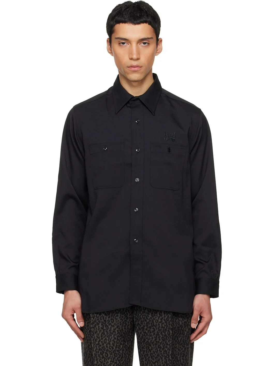Stretch cavalry twill shirt. · Spread collar · Button closure · Patch pockets and embroidered logo at chest · Zip pockets at front · Shirttail hem · Buttoned barrel cuffs Supplier color: Black 86% polyester, 12% wool, 2% polyurethane. Made in Japan 252821M192023